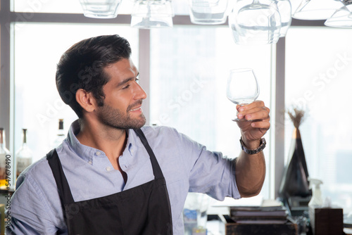 Young caucasian man is bartender holding and looking clean of glass with professional at counter, portrait handsome male preparation glass or wineglass, barman standing with confident at restaurant.
