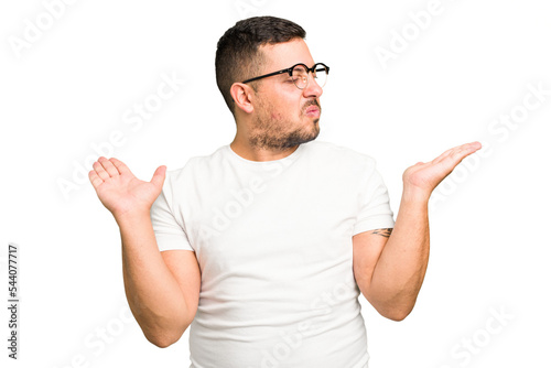 Young caucasian man isolated confused and doubtful shrugging shoulders to hold a copy space.