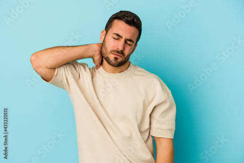 Young caucasian man isolated on blue background having a neck pain due to stress, massaging and touching it with hand.