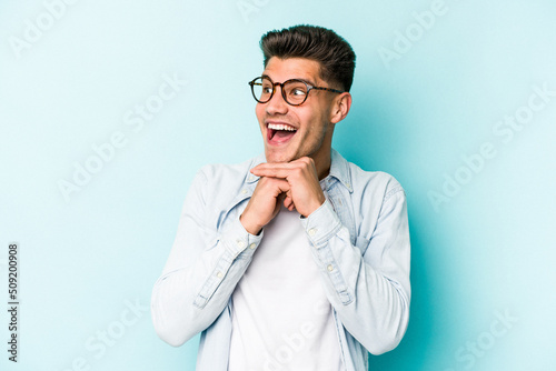 Young caucasian man isolated on blue background keeps hands under chin, is looking happily aside.