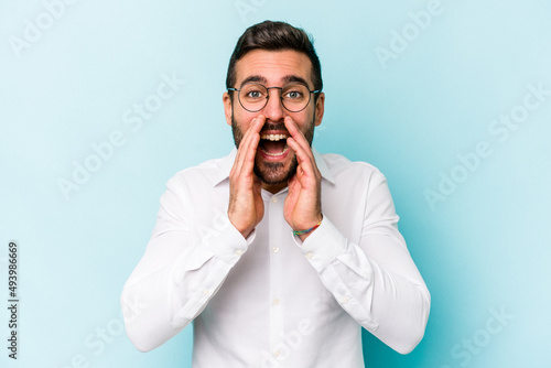Young caucasian man isolated on blue background saying a gossip, pointing to side reporting something.
