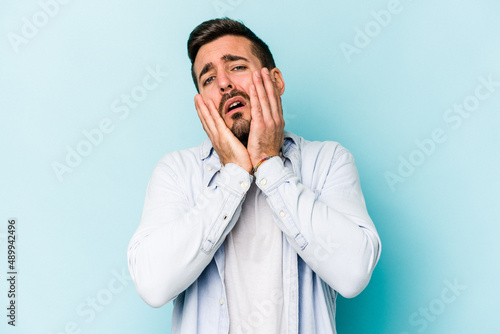 Young caucasian man isolated on blue background whining and crying disconsolately.