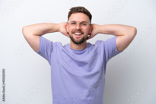 Young caucasian man isolated on white background laughing