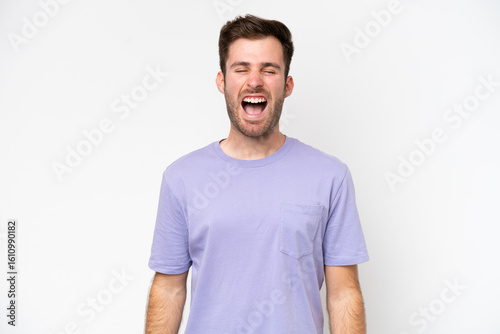 Young caucasian man isolated on white background shouting to the front with mouth wide open