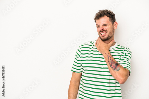 Young caucasian man isolated on white background touching back of head, thinking and making a choice.