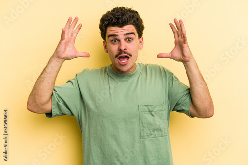 Young caucasian man isolated on yellow background celebrating a victory or success, he is surprised and shocked.