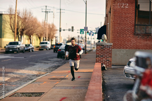 Young caucasian man jogging and exercising on a sidewalk in St Louis US