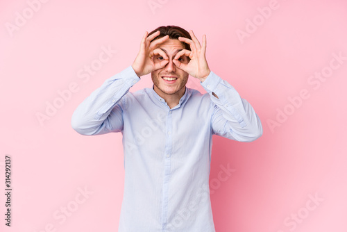 Young caucasian man posing in a pink background isolated showing okay sign over eyes