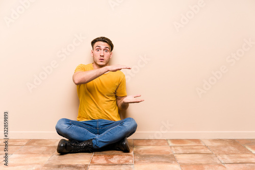 Young caucasian man sitting on the floor isolated shocked and amazed holding a copy space between hands.