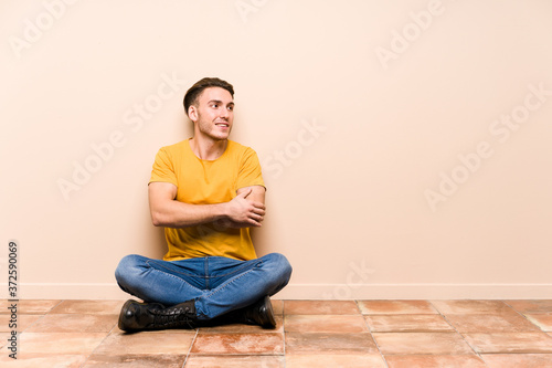 Young caucasian man sitting on the floor isolated smiling confident with crossed arms.