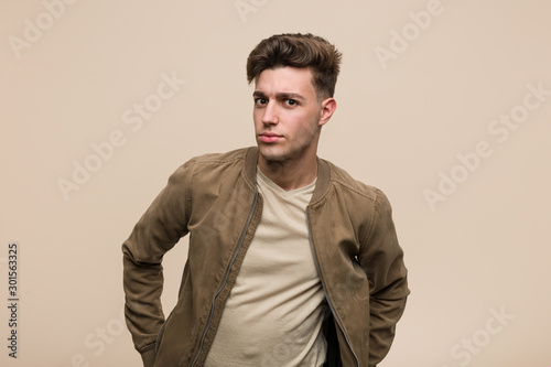 Young caucasian man wearing a brown jacket scolding someone very angry.