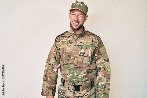 Young caucasian man wearing camouflage army uniform winking looking at the camera with sexy expression, cheerful and happy face.