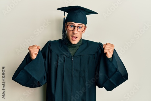 Young caucasian man wearing graduation cap and ceremony robe celebrating surprised and amazed for success with arms raised and open eyes. winner concept.