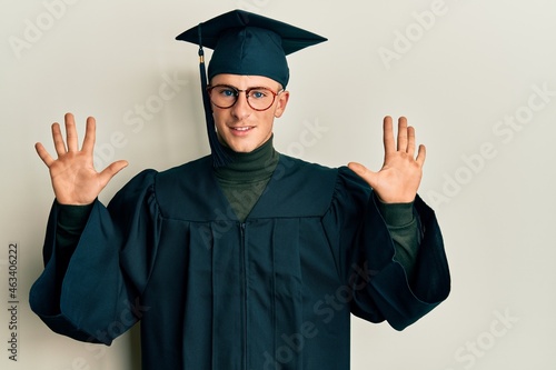 Young caucasian man wearing graduation cap and ceremony robe showing and pointing up with fingers number ten while smiling confident and happy.