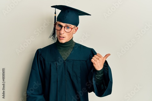 Young caucasian man wearing graduation cap and ceremony robe smiling with happy face looking and pointing to the side with thumb up.