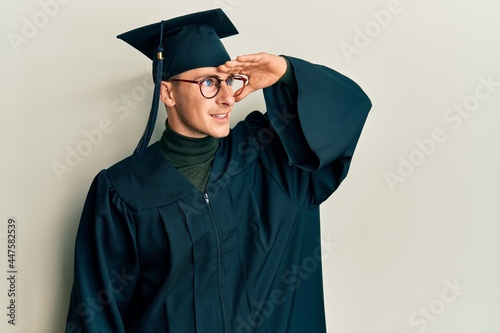 Young caucasian man wearing graduation cap and ceremony robe very happy and smiling looking far away with hand over head. searching concept.