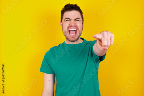 young Caucasian man wearing green T-shirt against yellow wall pointing displeased and frustrated to the camera, angry and furious ready to fight with you.