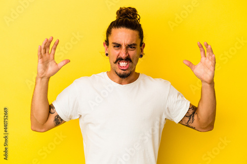 Young caucasian man with long hair isolated on yellow background screaming with rage.