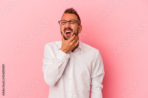 Young caucasian man with tattoos isolated on pink background having a strong teeth pain, molar ache.