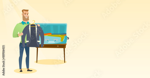 Young caucasian white man packing his clothes in an opened suitcase. Smiling man putting a jacket into a suitcase. Cheerful man preparing for vacation. Vector cartoon illustration. Horizontal layout.