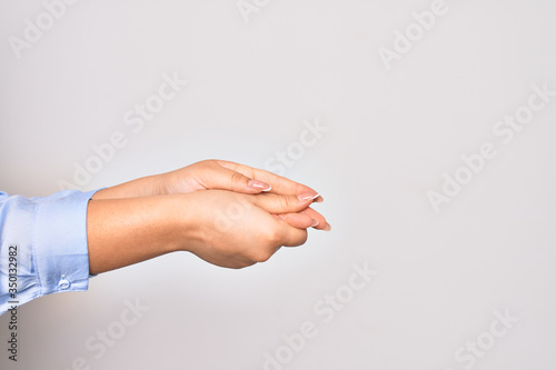 Young caucasian woman cleaning hands using alcohol liquid over isolated white background