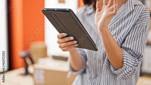 Young caucasian woman ecommerce business worker using touchpad at office