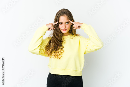 Young caucasian woman focused on a task, keeping forefingers pointing head.