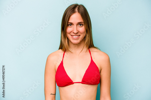 Young caucasian woman going to the beach isolated on blue background happy, smiling and cheerful.