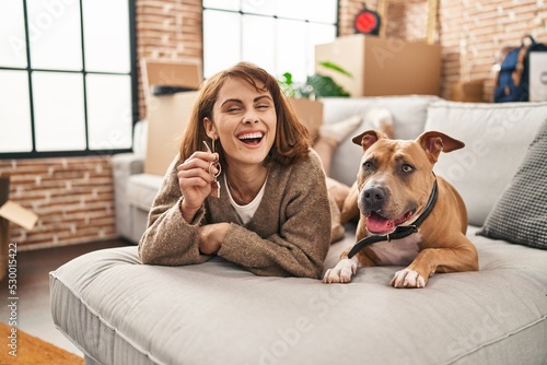 Young caucasian woman holding key of new house lying on sofa with dog at new home