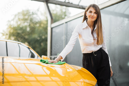Young caucasian woman in business outfit, shirt and trousers on a white shirt and black trousers wiping yellow car hood with green microfiber cloth at the open air car wash.