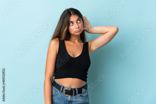 Young caucasian woman isolated on blue background listening to something by putting hand on the ear