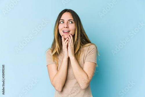 Young caucasian woman isolated on blue background making up plan in mind, setting up an idea.