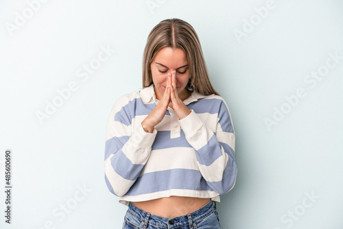 Young caucasian woman isolated on blue background praying, showing devotion, religious person looking for divine inspiration.