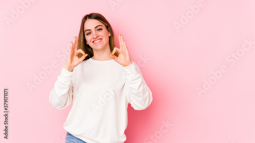 Young caucasian woman isolated on pink background cheerful and confident showing ok gesture.