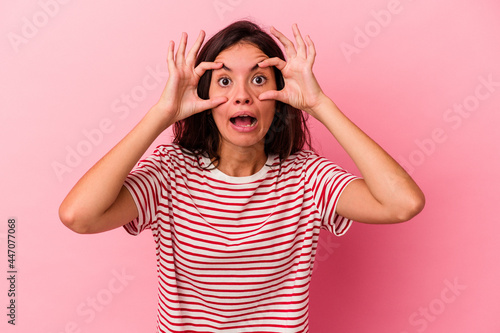 Young caucasian woman isolated on pink background keeping eyes opened to find a success opportunity.