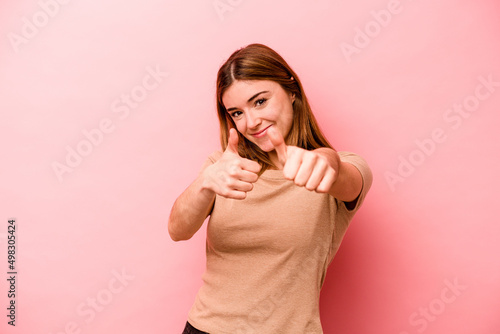 Young caucasian woman isolated on pink background raising both thumbs up, smiling and confident.