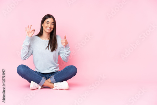 Young caucasian woman isolated on pink background showing ok sign and thumb up gesture