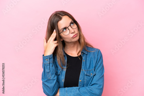 Young caucasian woman isolated on pink background with problems making suicide gesture