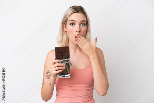 Young caucasian woman isolated on white background taking a chocolate tablet and surprised