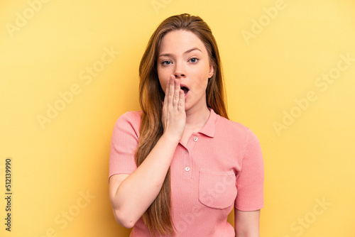 Young caucasian woman isolated on yellow background yawning showing a tired gesture covering mouth with hand.
