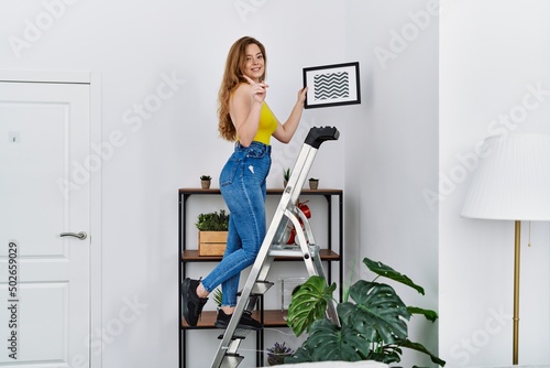 Young caucasian woman on stairs hanging picture on the wall smiling happy pointing with hand and finger to the side