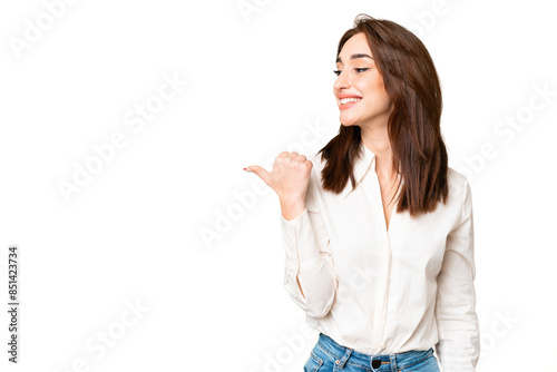 Young caucasian woman over isolated chroma key background pointing to the side to present a product