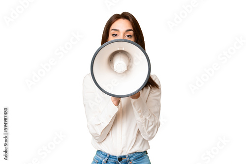 Young caucasian woman over isolated chroma key background shouting through a megaphone