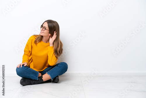 Young caucasian woman sitting on the floor isolated on white background listening to something by putting hand on the ear