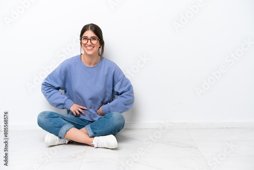Young caucasian woman sitting on the floor isolated on white background posing with arms at hip and smiling