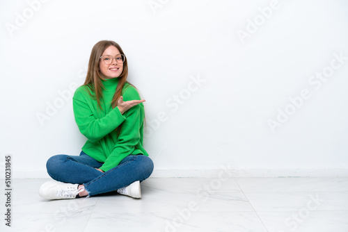 Young caucasian woman sitting on the floor isolated on white background presenting an idea while looking smiling towards