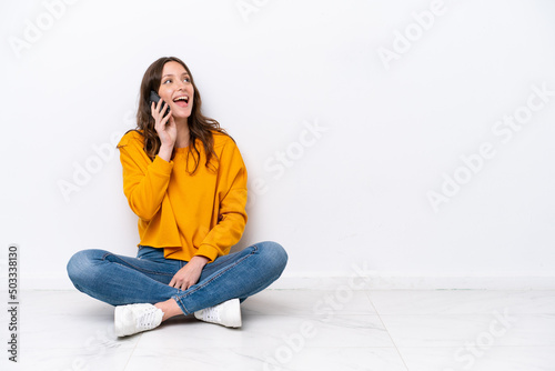 Young caucasian woman sitting on the floor isolated on white wall keeping a conversation with the mobile phone