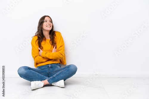 Young caucasian woman sitting on the floor isolated on white wall looking up while smiling