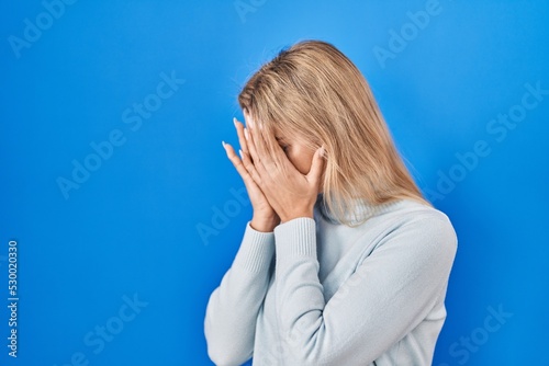 Young caucasian woman standing over blue background with sad expression covering face with hands while crying. depression concept.