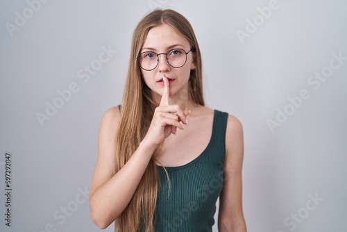 Young caucasian woman standing over white background asking to be quiet with finger on lips. silence and secret concept.